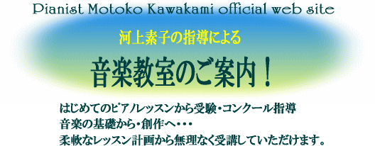 河上素子の音楽教室は、音楽を「ことば」として捉え、自分の感性で使いこなすことが できるようにということを大きな目標に掲げています。 感性を育てることと、基本をしっかり身につけさせることが得意です。 子供が大好きです。何より教えることが好き。